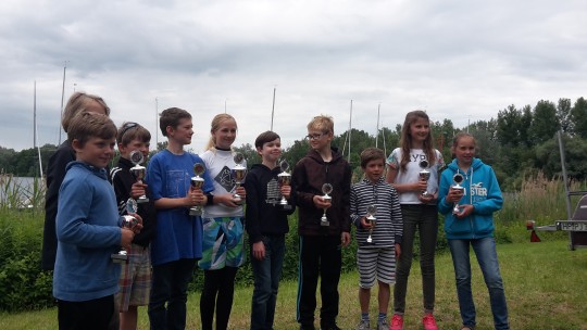 Landesmeister Opti B / BW 2016 Sebastian Höke 5.v.re, Landesmeisterin Opti B / BW 2016 Sarah Springer 5.v.li., Vizemeister Felix Vogt 4.v.li. 3. Platz Luca Wolf (SCGN) 4.v.re u. 8. Platz Luca Renkes (SCGN) 1.v.li.